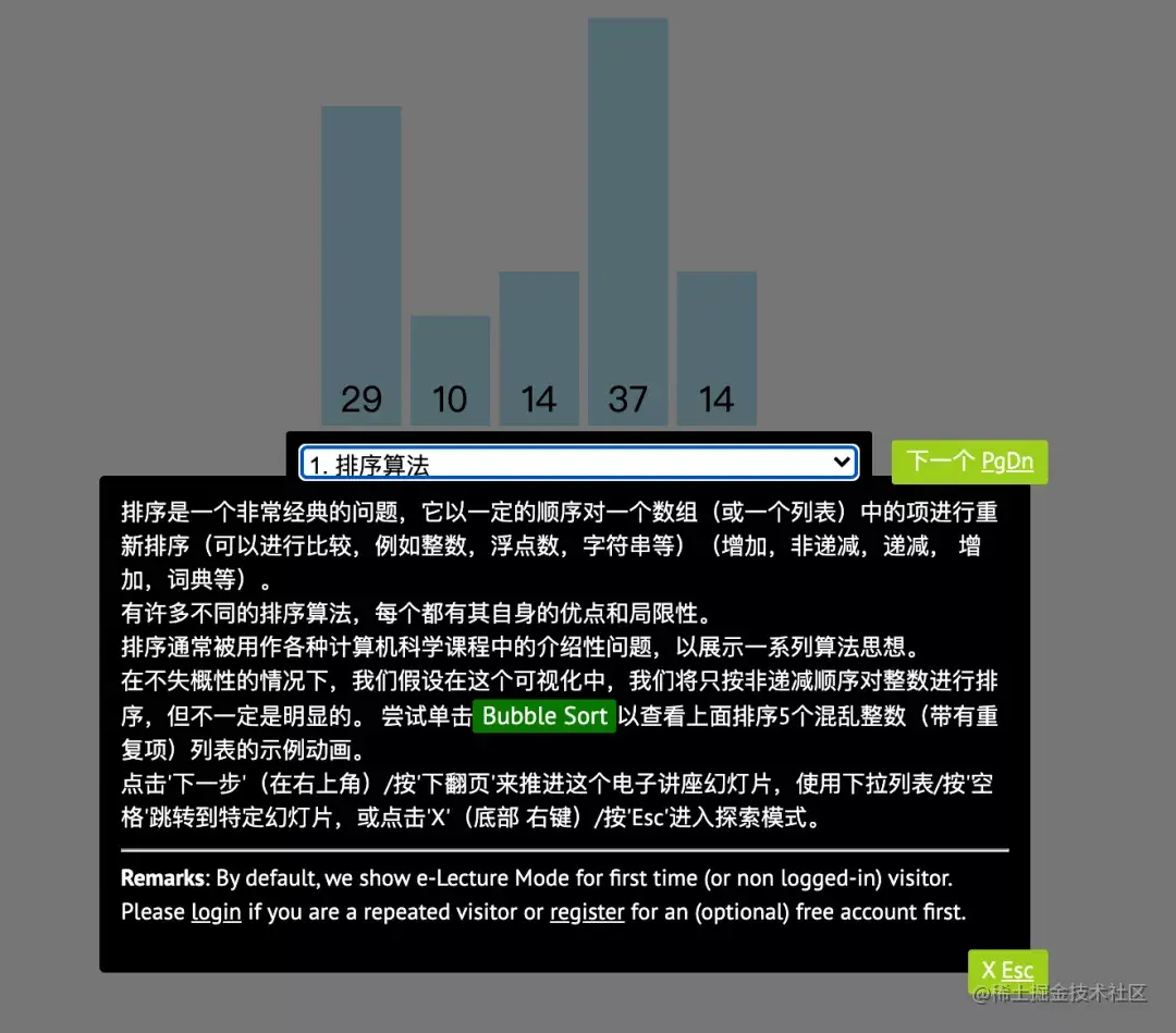 除此之外,该网站也是可以以动画的方式演示算法的,而且还包含了算法的文字讲解,可以很方便的学习到你所想要了解的算法,如下图所示: