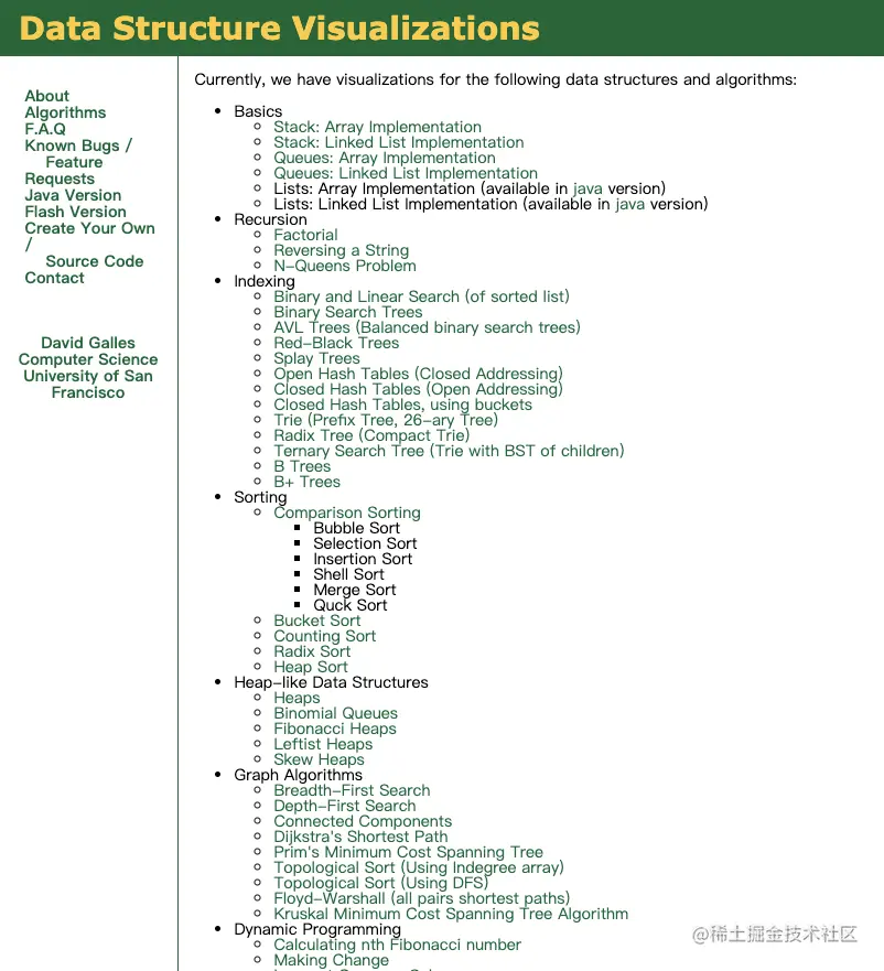 于是我就琢磨着应该会有更简单的学习数据结构和算法的方法?然后经过一轮技术论坛的“逛街”之后,终于找到了一些可以比较直观而又简单的学习数据结构和算法的网站。