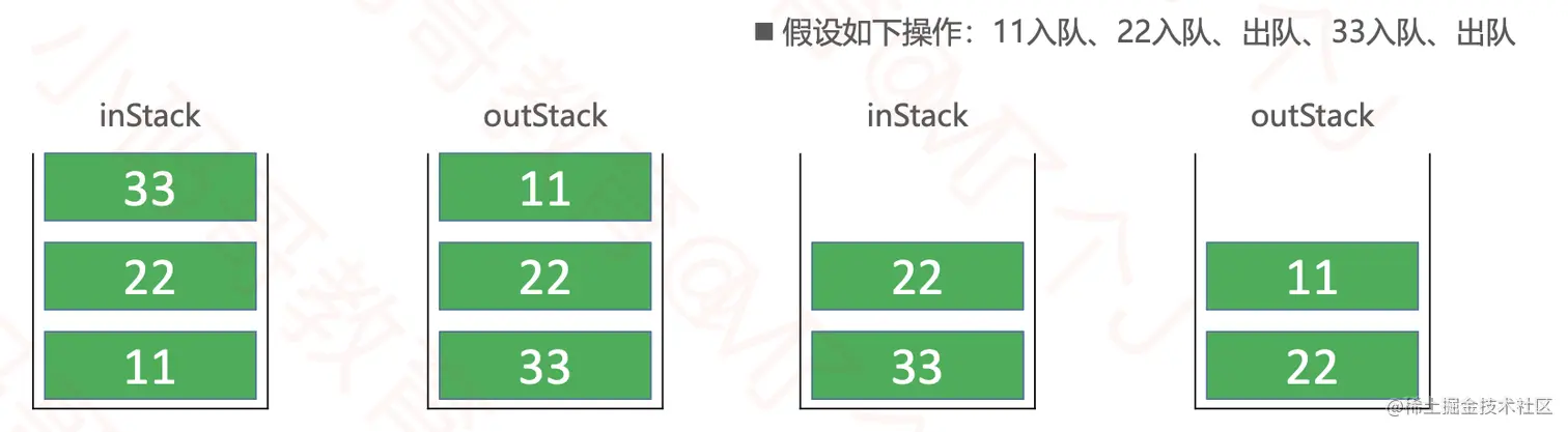 - 如果outStack为空,将instack所有元素逐一弹出,push到outstack,outstack弹出栈顶元素
