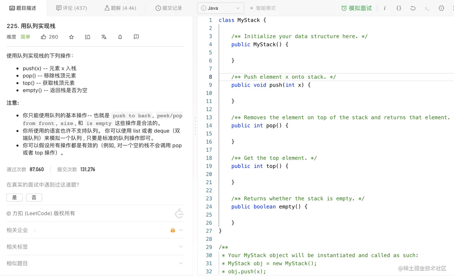 入栈操作时,首先获得入栈前的元素个数 n n,然后将元素入队到队列,再将队列中的前 n n 个元素(即除了新入栈的元素之外的全部元素)依次出队并入队到队列,此时队列的前端的元素即为新入栈的元素,且队列的前端和后端分别对应栈顶和栈底。