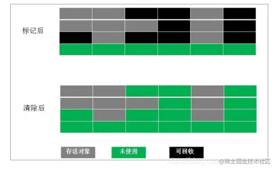 最基础的垃圾回收算法,分为两个阶段,标注和清除。标记阶段标记出所有需要回收的对象,清除阶段回收被标记的对象所占用的空间。如图: