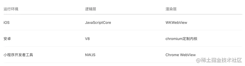而在小程序三大运行环境中,逻辑层和渲染层的实现也是有一些区别的: