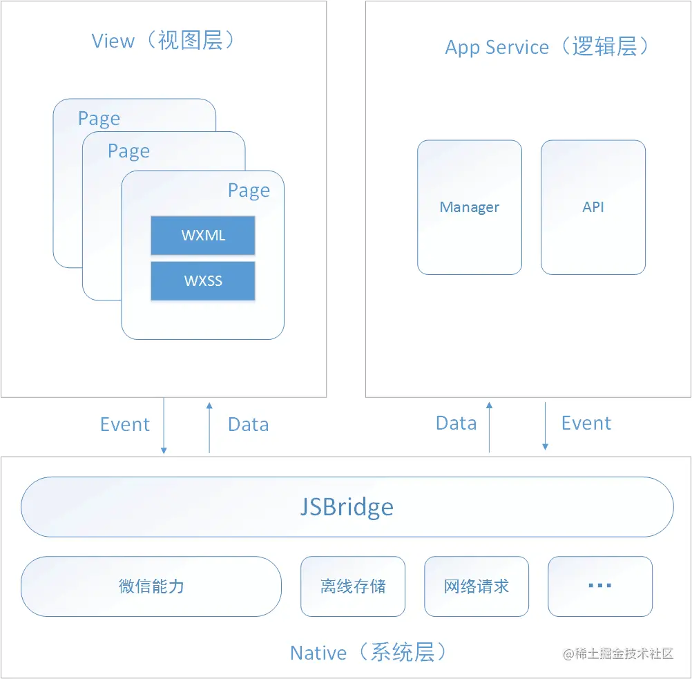 AppService和AppView之间通过Native(系统层)来做中转媒介,如下图: