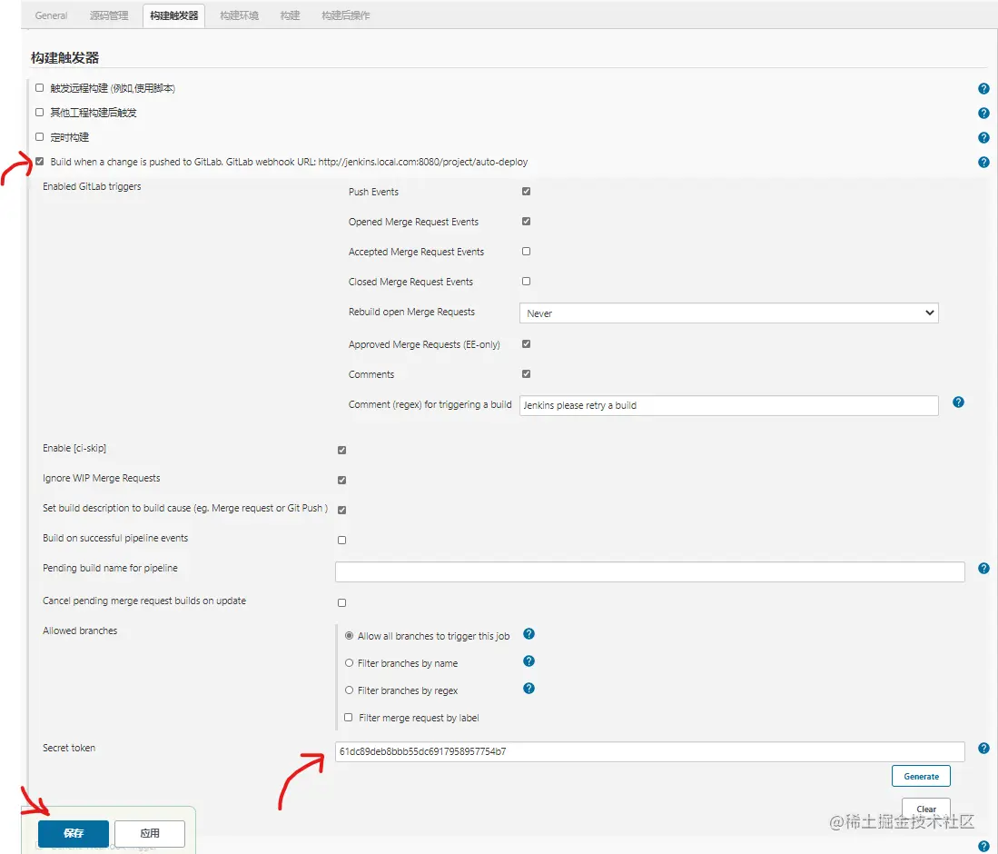 拷贝:jenkins.local.com:8080/project/aut… Secret token:61dc89deb8bbb55dc6917958957754b7