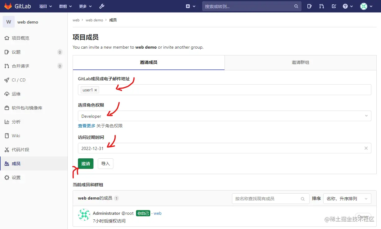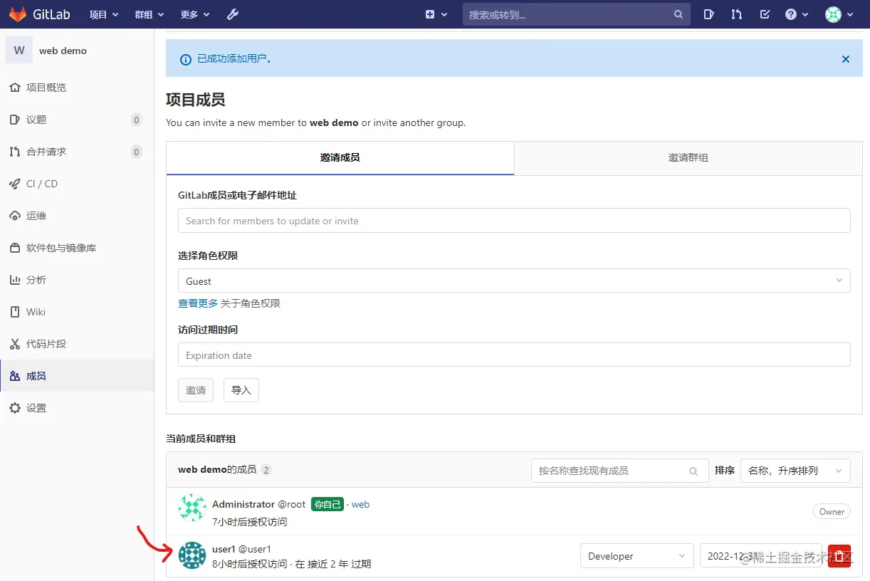 分配user1 给 web-demo