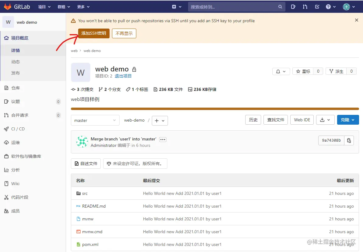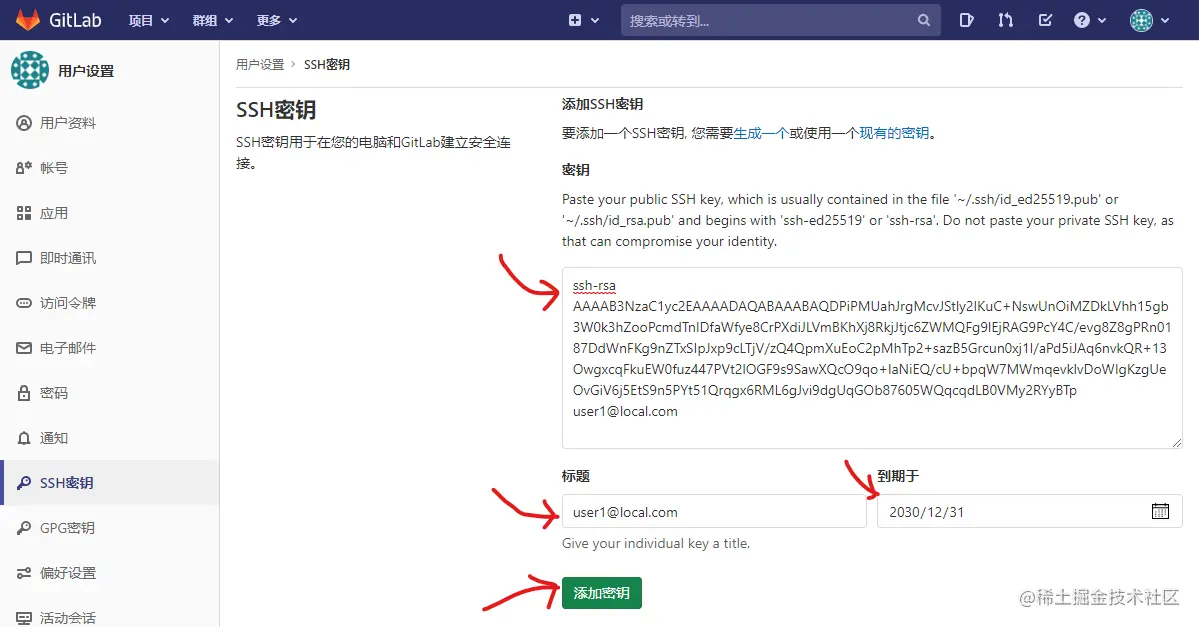在GitLab代码仓库,添加4.3 产生的公钥