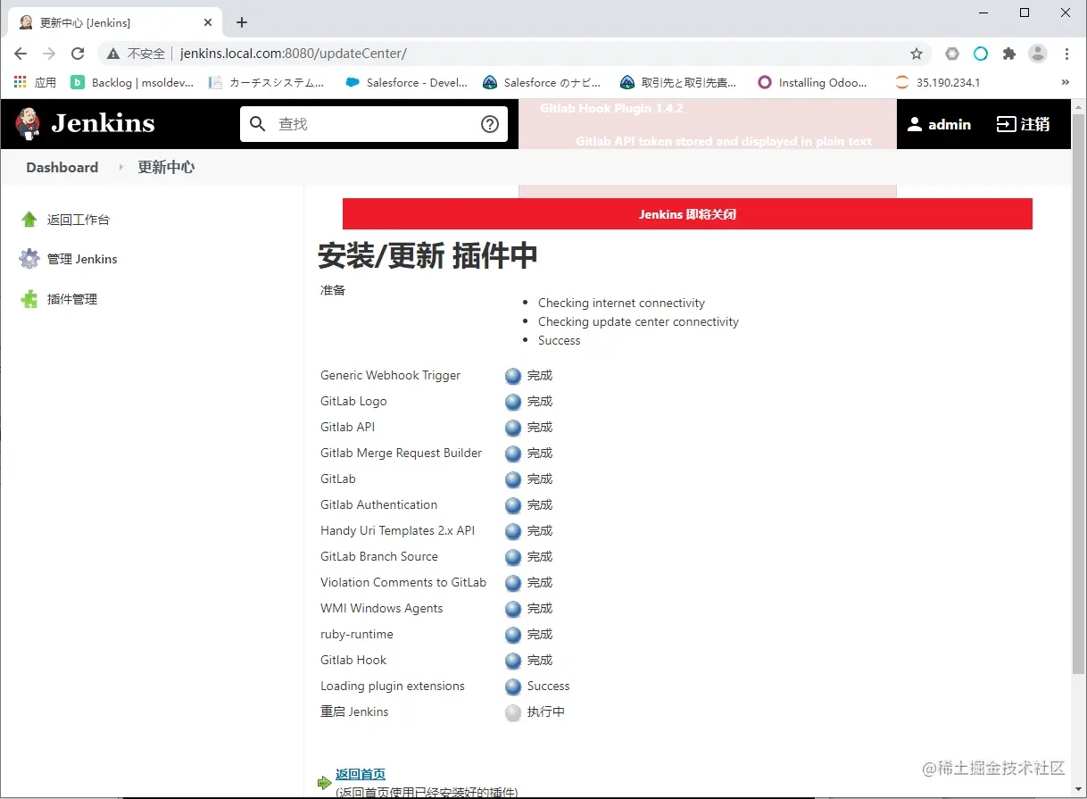 点击[install without restart]即可,等待安装完毕重新启动Jenkins。