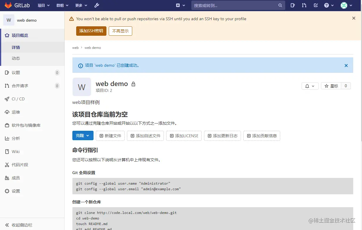 注意事项:新建项目往往还没有master分支,需要确认;另外如果权限是developer也要和分支匹配才行。 代码样例:gitee.com/actual-comb…