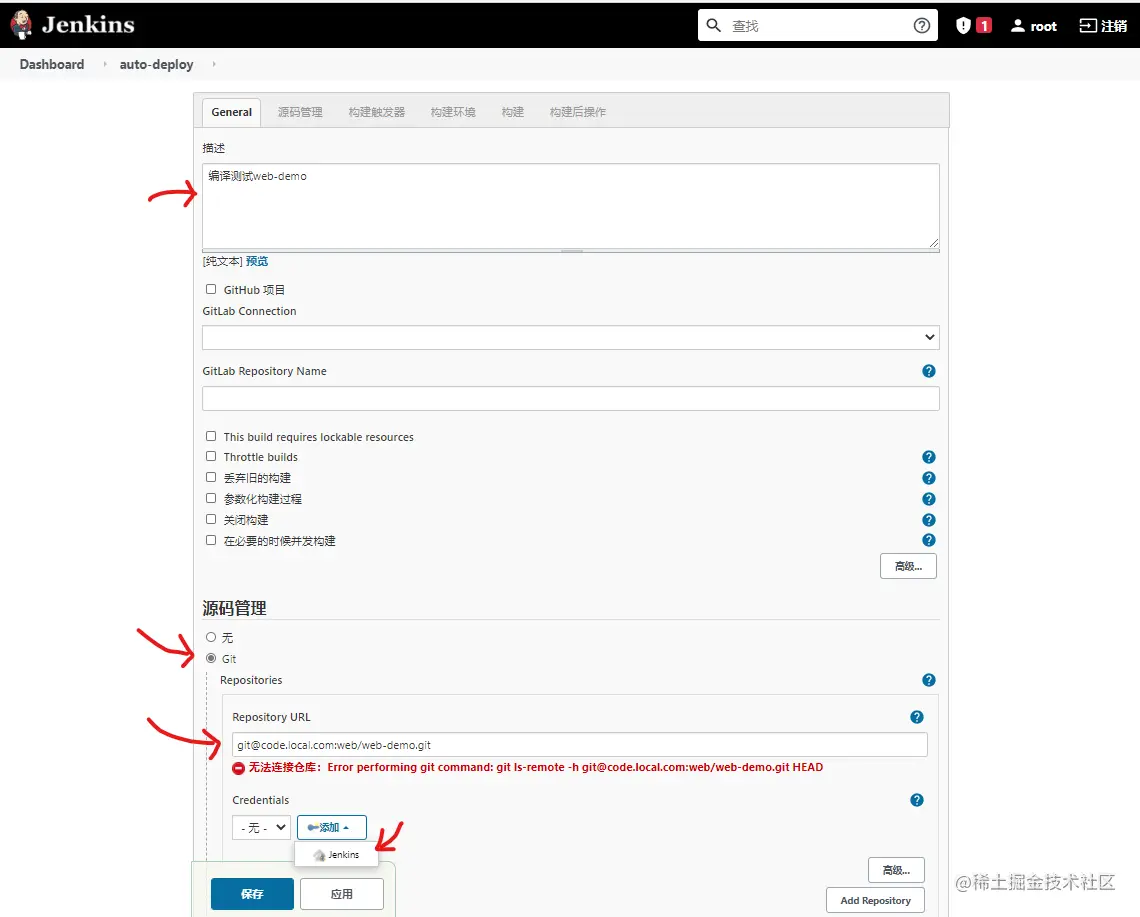 在源码管理添加源码路径,点击Add,添加认证,这里是git