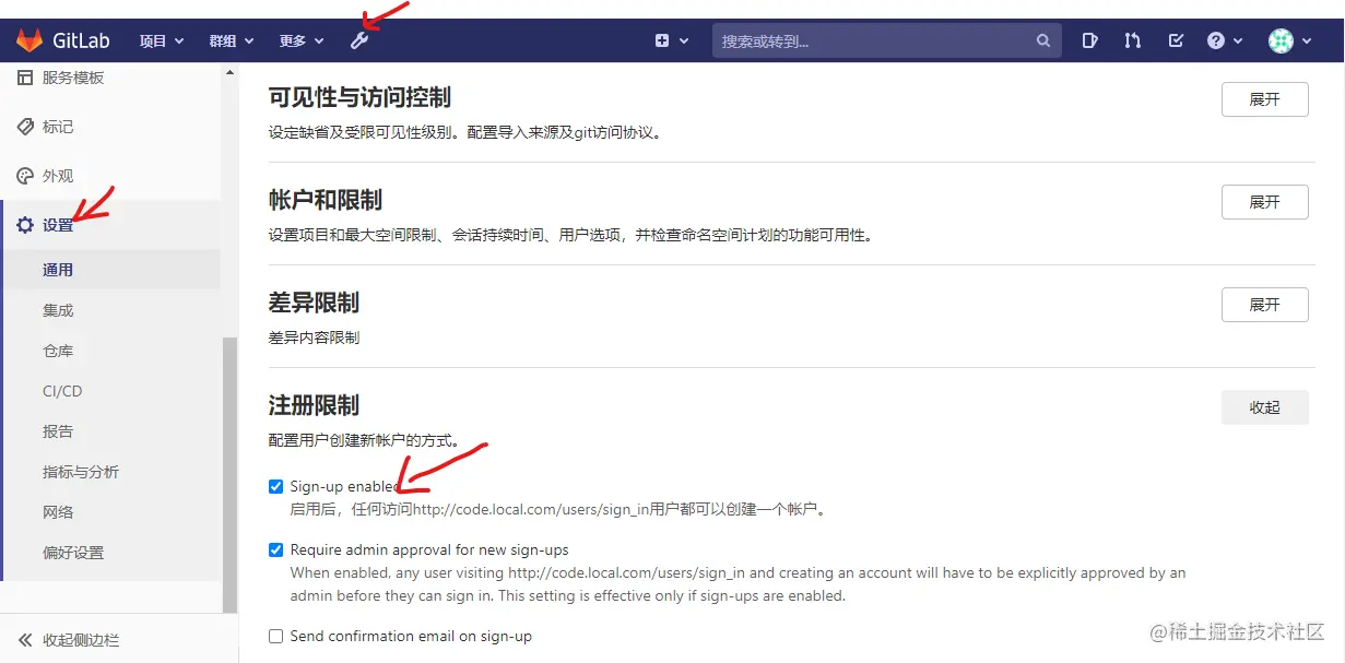 点击设置 把Sign-up enabled的钩去掉,就可以去掉创建账户的功能