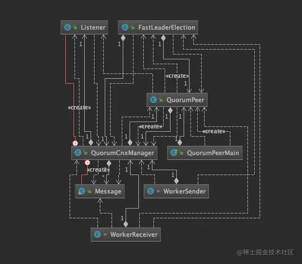 先分析下这些类的关系,其中 FastLeaderElection 持有 QuorumCnxManager 通过该类管理服务器之间端到端的连接;
