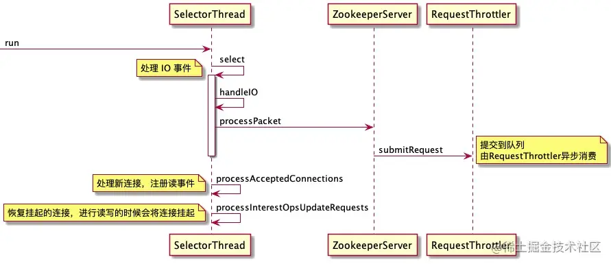 在 RequestThrottler 线程运行过程中,将从队列 submittedRequests 获取请求数据,并交由 ZookeeperServer.firstProcessor 处理。
