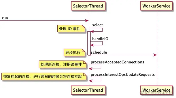 其中 SelectorThread 和 AcceptThread 的关系是,AcceptThread 将客户端连接接入后,选择一个 SelectorThread 进行绑定,实现方式是将 SocketChannel 放入 SelectorThread.acceptedQueue 中。