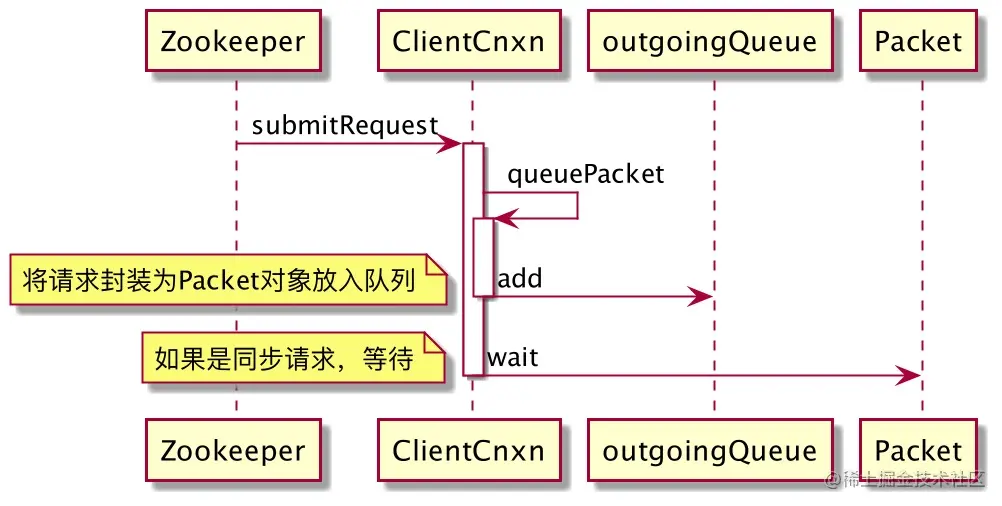 客户端发送请求的方式是将消息放入一个阻塞队列中,之后由 SendThread 来依次消费,这样保证了消息的有序性,谁先到谁先处理。