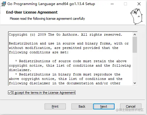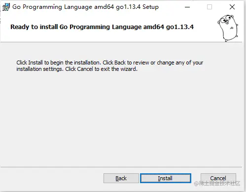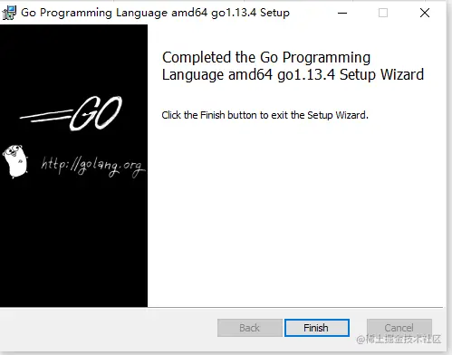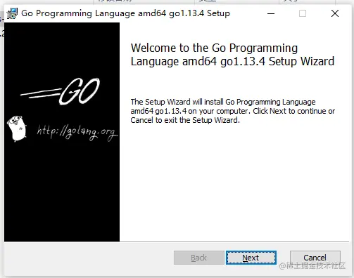 双击你下载的安装包(go1.13.4.windows-amd64.msi),一直点击“Next”即可,注意有一步要求选择安装路径,为了后面教程好说明请不要更改。