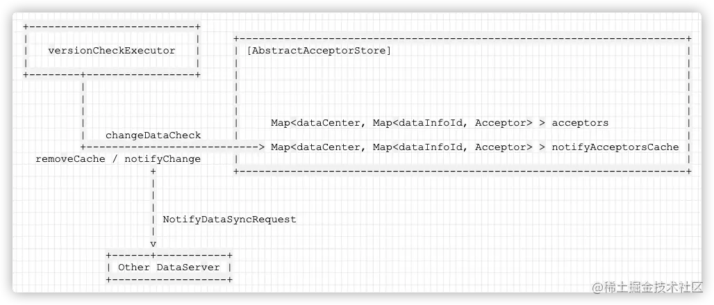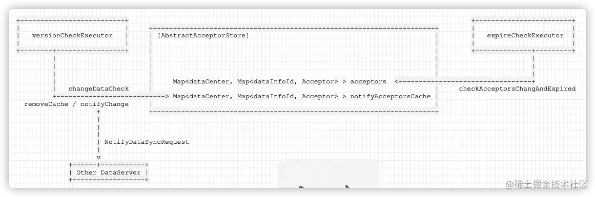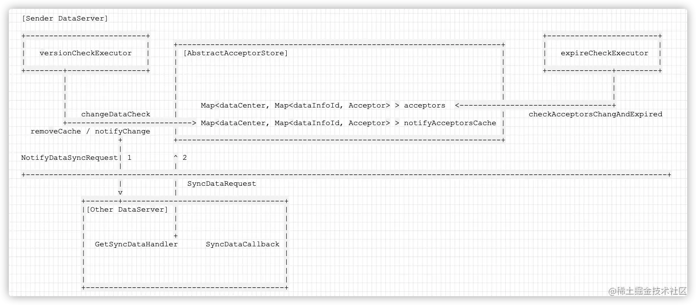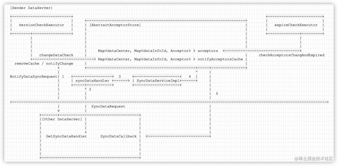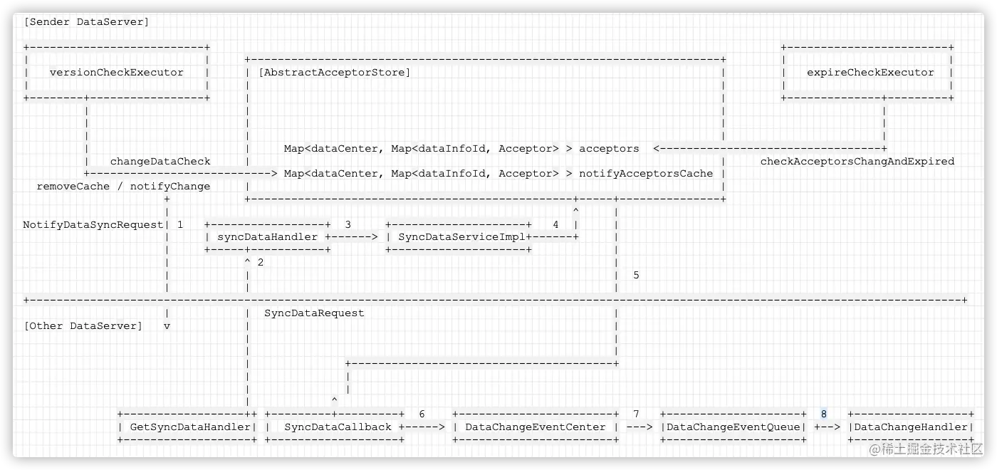- 同时,异步地,DataServer 以 dataInfoId 维度增量地同步数据给其他副本。因为 DataServer 在一致性 Hash 分片的基础上,对每个分片保存了多个副本(默认是3个副本)。