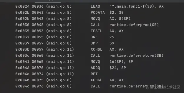 执行如下指令:go tool compile -N -l -S main.go,截取部分汇编指令如下: