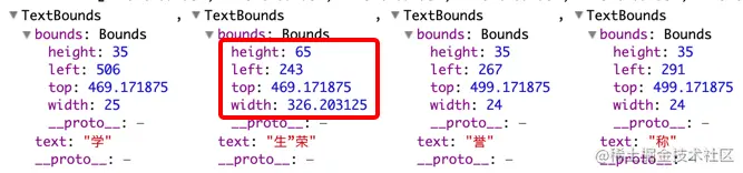 这四个数据组成了左上角点的坐标+宽高,也就是元素所占据的面积,所以可以得出的是其他组都是单个字所占据的小面积,而 生”荣 占据的面积却横跨了两个行段: