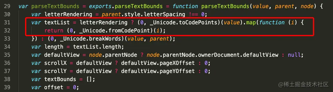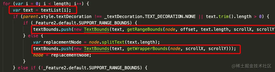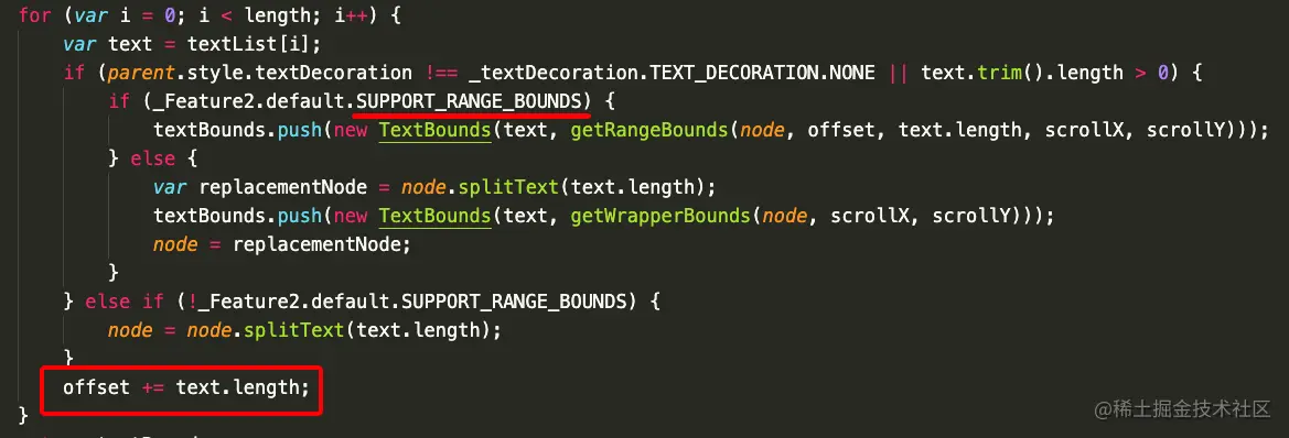 3、但接着在 SUPPORT_RANGE_BOUNDS 的相关代码附近发现,有一句可疑的 offset += text.length,怀疑这整个 parseTextBounds 方法可能就是导致问题出现的罪魁祸首