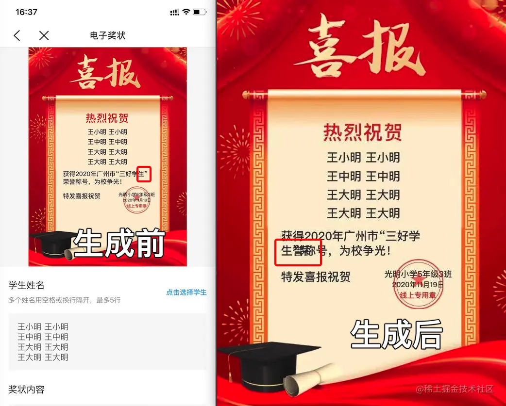 项目中有一个制作电子奖状的需求,需要根据奖状模板和用户编辑的文字生成不同的奖状图片,因此使用了 html2canvas 来将 DOM 元素转为 canvas 再生成图片。