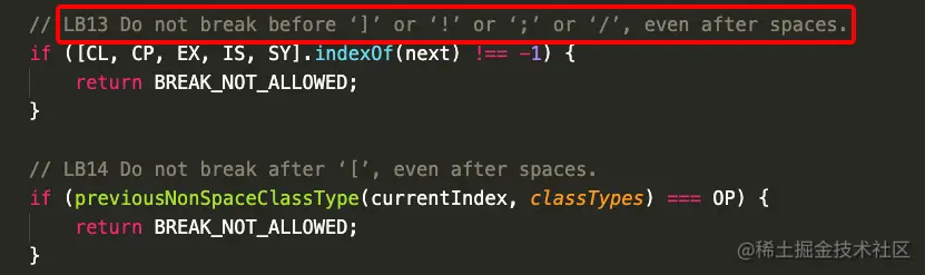 而 _Unicode.breakWords 较为复杂,经过一段时间的查阅后得出其调用了 css-line-break 模块的字符分割方法,而其方法中会对各种符号进行特殊处理,使其与前一个字符保持相连: