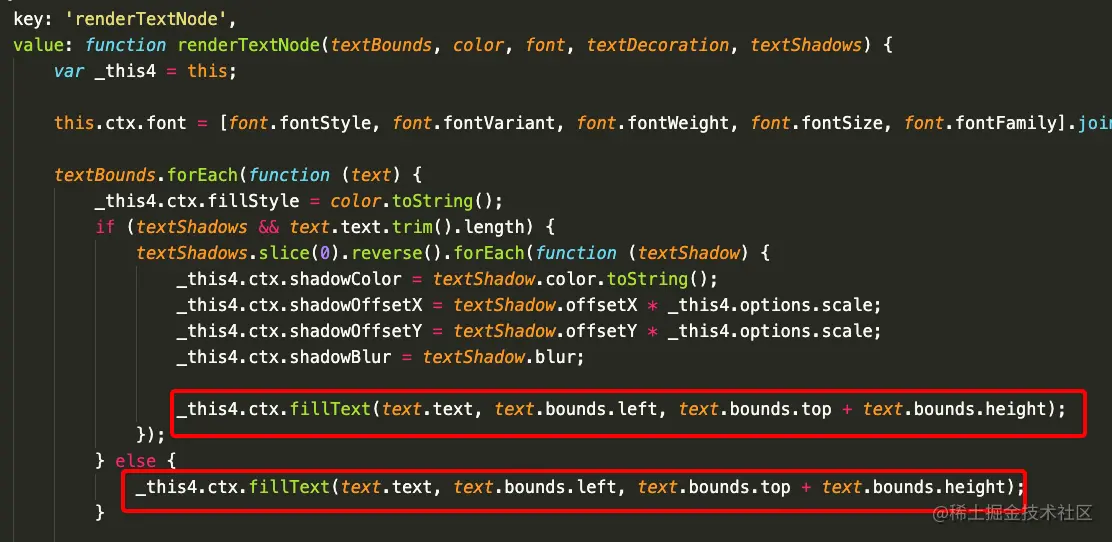 bounds 属性发现其被使用到的地方还是很多的,观察函数名大都是 render xxx element 之类,于是这里直接定位到听名字最有可能的 renderTextNode 方法,并在其中找到 bounds 作为 ctx.fillText 的参数使用: