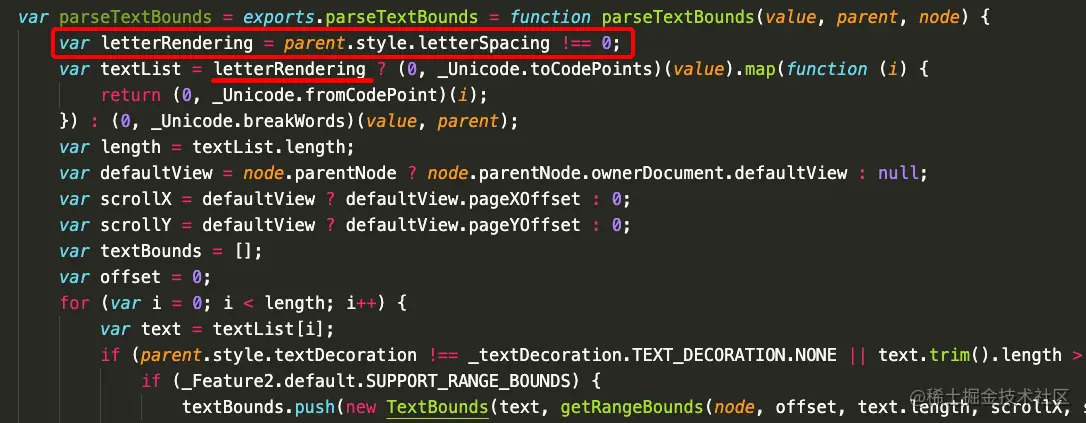 4、于是解决问题的方向转为怎么消除引号与后一个字符的连接,在代码上文对 textList 的获取方式中看到了 letterRendering 的判断: