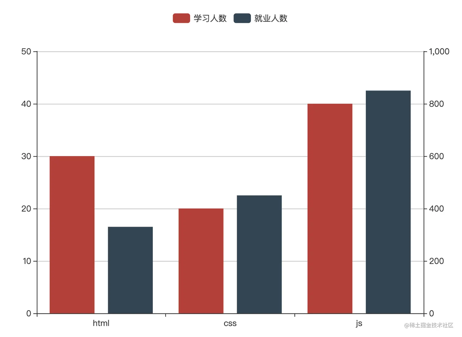 然后在配置series 的时候以数组的方式,声明好每个系列对应的坐标轴即可,这样就可以生成上面图片那样的图表