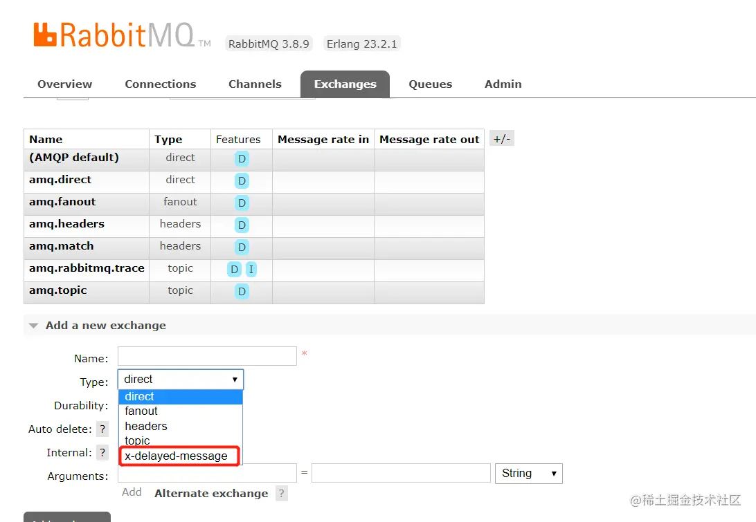 打开RabbitMQ的管理页面,我们看到x-delayed-message已经出来了,这样就可以定义延迟队列了。