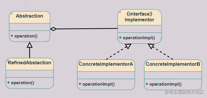 - 实例化(Implementor)角色: 定义实现化角色的接口,供扩展抽象化角色调用