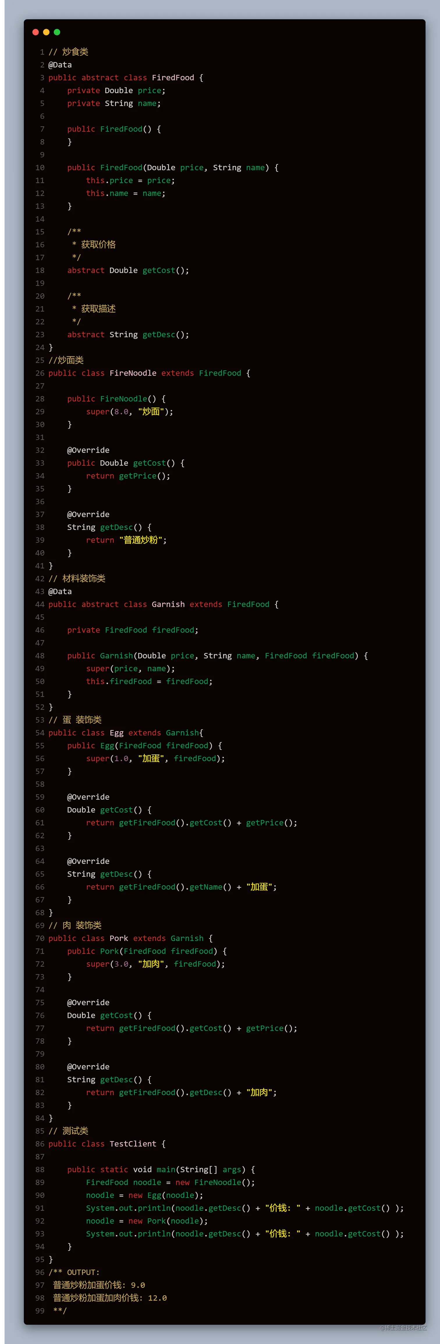 - 具体装饰(ConcreteDecorator): 实现抽象装饰的相关方法,并给具体构件对象添加附加的责任