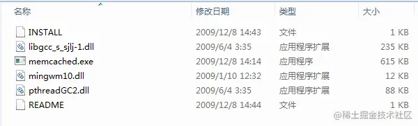 32bit:下载 memcached-win32-1.4.4-14.zip(直接下)里面包含6个文件,将解压后的文件夹随便放在什么位置(例如:D:\memcached)。
