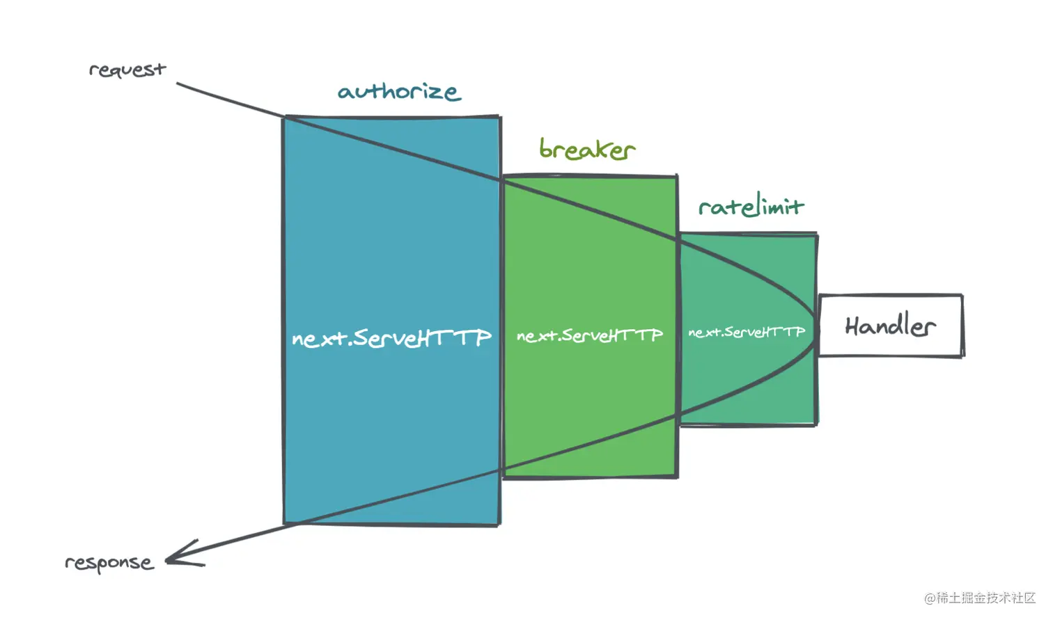 web框架中的中间件是实现业务和非业务功能解耦的一种方式,在web框架中我们可以通过中间件来实现诸如鉴权、限流、熔断等等功能,中间件的原理流程如下图