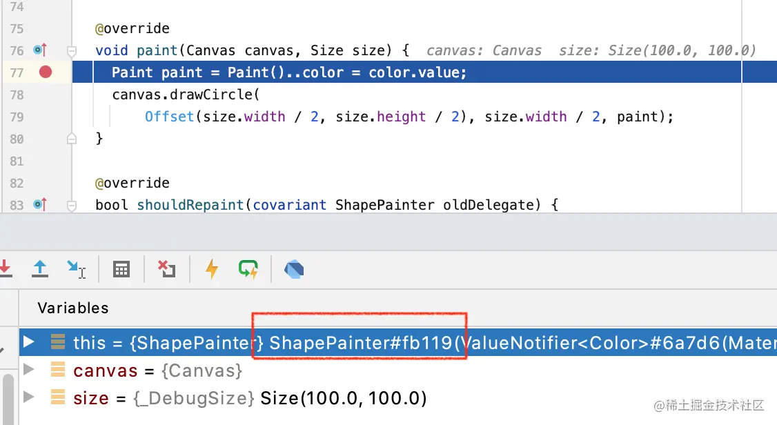 通过这种方式,点击时在 paint 方法断点调试,结果如下。可以看出,在完成颜色变化的同时,没有任何组件的重建,ShapePainter 对象也没有变化,是不是感觉非常神奇。