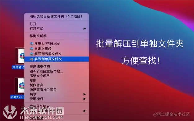 ③【多文件批量解压到单独文件夹】支持选中多个文件,将每个文件解压到单独的文件夹中。