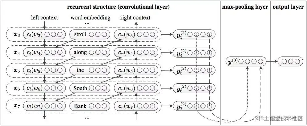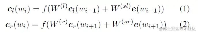 **RCNN****算法过程:**首先,采用双向LSTM学习word的上下文,利用前向和后向RNN得到每个词的前向和后向上下文的表示: