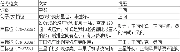 其中词级别和句子级别的分析对象分别是一个词和整个句子的情感正负向,不区分句子中具体的目标,如实体或属性,相当于忽略了五要素中的实体和属性这两个要素。词级别情感分析,即情感词典构建,研究的是如何给词赋予情感信息。句子级/文档级情感分析研究的是如何给整个句子或文档打情感标签。而目标级情感分析是考虑了具体的目标,该目标可以是实体、某个实体的属性或实体加属性的组合。具体可分为三种:Target-grounded aspect based sentiment analysis (TG-ABSA), Target no aspect based sentiment analysis (TN-ABSA), Target aspect based sentiment analysis (T-ABSA). 其中TG-ABSA的分析对象是给定某一个实体的情况下该实体给定属性集合下的各个属性的情感分析;TN-ABSA的分析对象是文本中出现的实体的情感正负向;T-ABSA的分析对象是文本中出现的实体和属性组合。下表例举了不同目标的情感分析任务: