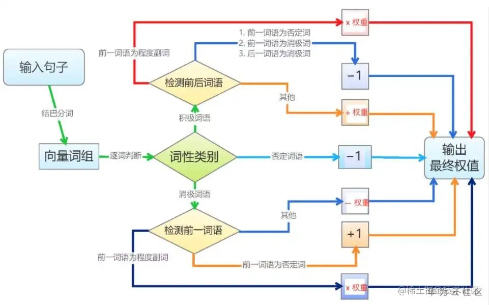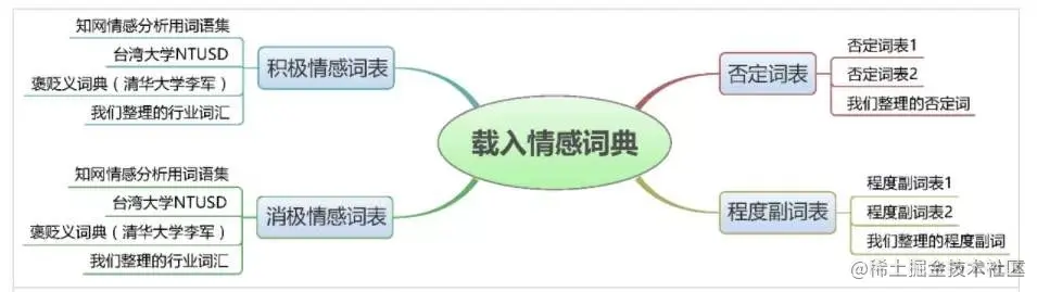 当然也可以通过语料来自己训练情感词典。导入情感词典后,我们需要利用情感词典文本匹配算法进行情感分析。基于词典的文本匹配算法相对简单。逐个遍历分词后的语句中的词语,如果词语命中词典,则进行相应权重的处理。正面词权重为加法,负面词权重为减法,否定词权重取相反数,程度副词权重则和它修饰的词语权重相乘。利用最终输出的权重值,就可以区分是正面、负面还是中性情感了。一个典型的利用情感词典文本匹配算法进行情感分析的算法流程如下[5]: