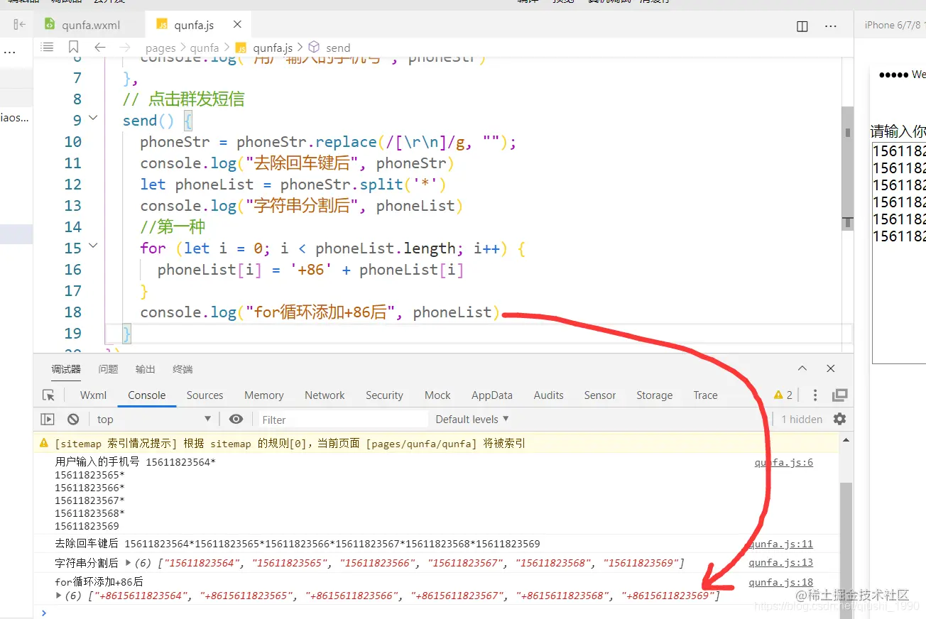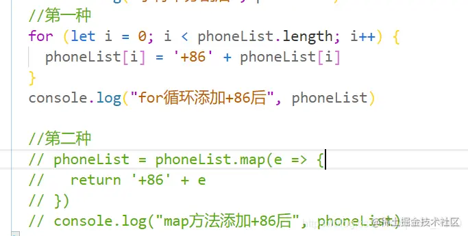 那么我们接下来就要遍历数组,给每个手机号前面都添加‘+86’了。