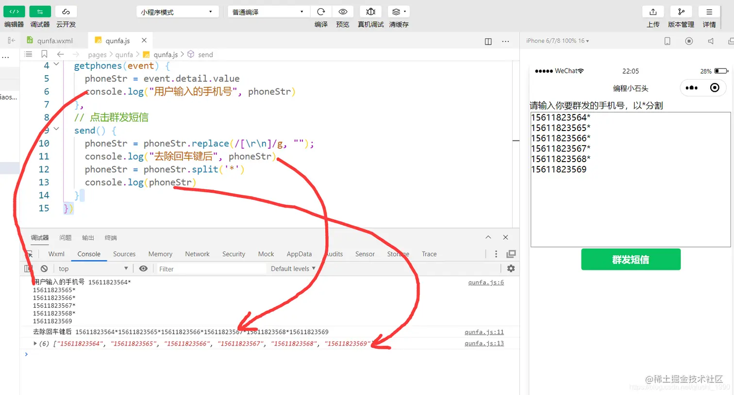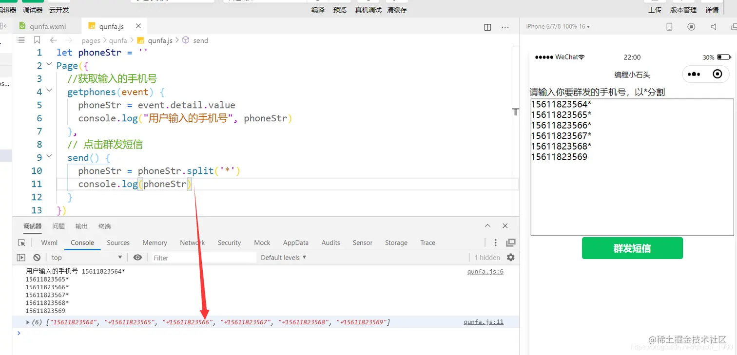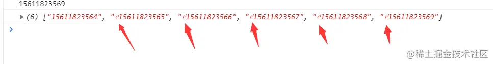 但是我们数组里的手机号前面有个回车键,所以安全起见,我们在分割字符串之前,需要先把这回车键给剔除掉。