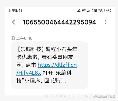 细心的同学可能看到了,我们短信里有个链接,其实这个链接可以实现我们短信唤起小程序功能的。想想看,我们给用户群发短信的目的,不就是为了让用户重新回到我们小程序吗。所以短信能唤起小程序,是不是方便了用户呢。下一节给大家讲短信唤起小程序的功能实现。