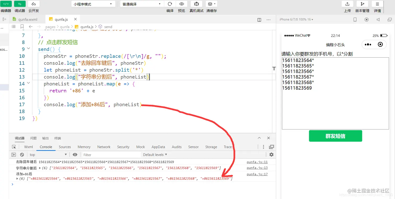5,遍历数组给手机号前面+86