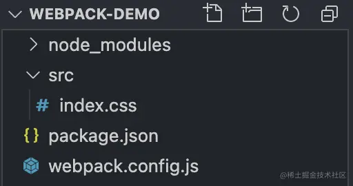 在 src 目录下新建了一个 index.css 文件,这里新建这个文件的目的就是以 css 文件为入口,尝试使用 webpack 单独打包它。