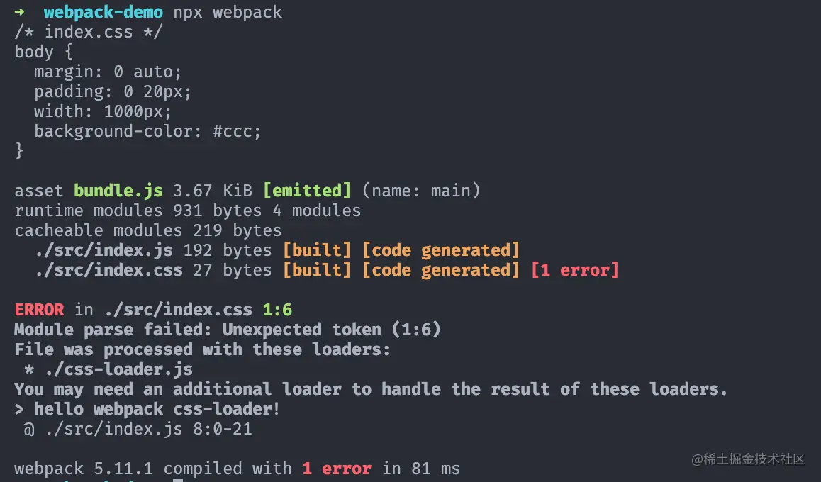 还是接着刚才打包 index.css 报错的问题。想加载 css 文件,我们可以试试常用的 css-loader。