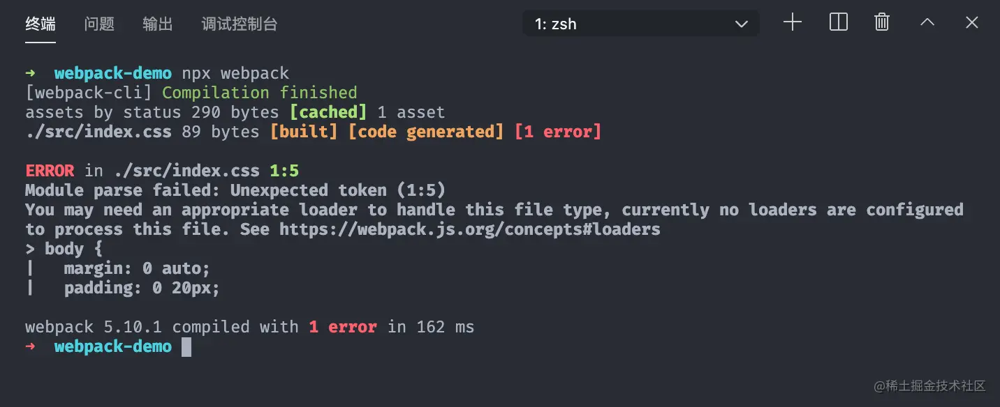 然后我们到终端运行 npx webpack 命令,你会发现命令行会提示 Module parse failed: Unexpected token (1:5) 模块解析错误。