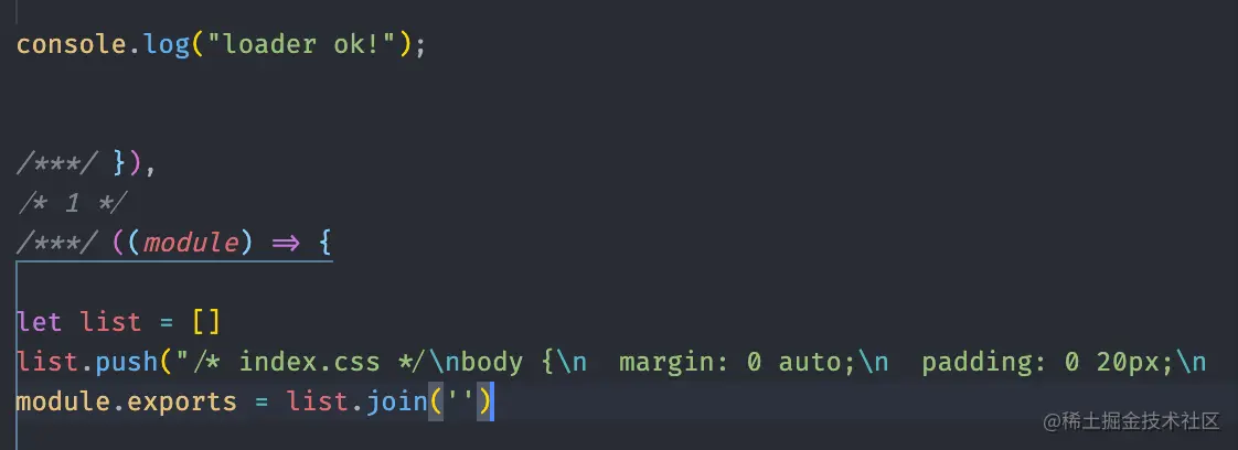 这是输出的 bundle.js 的片段,就是把我们刚刚返回的字符串直接拼接到了该模块中。这里也解释了刚才打包语法报错的问题(loader 处理完必须返回 JS 代码)。
