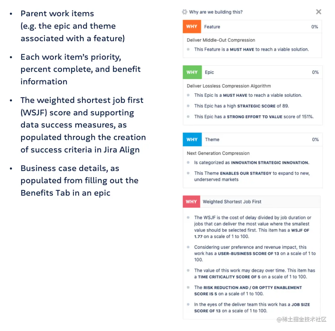 此功能可帮助管理者在 Jira Align 中表达意图和方向。当您的团队需要了解其工作正在实现的更广泛的目标时,他们可以单击“为什么”按钮并阅读上下文信息,例如: