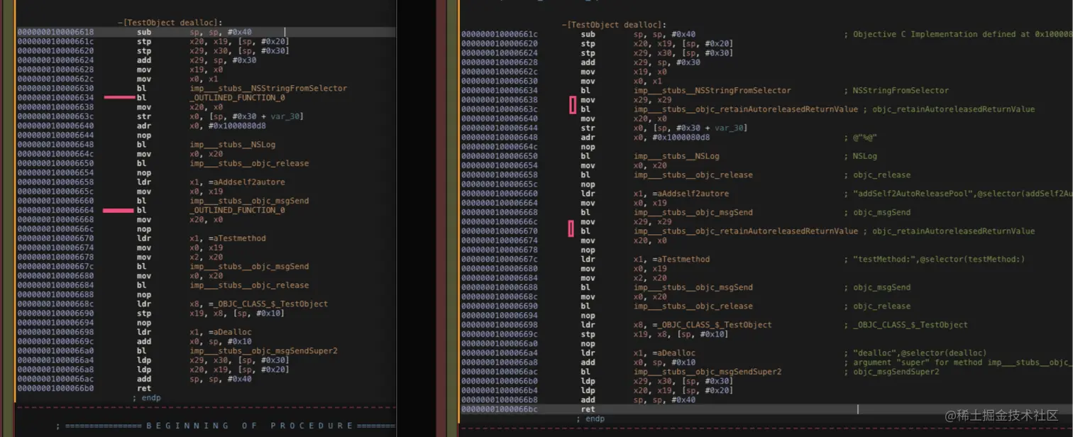 看到这个标志也无需额外 retain,两者配合从而优化掉了一次 autorelease 和 retain 操作,但这是优化细节,语义上仍然应该把它当作一个 autorelease 对象。而开启了 Oz 之后标记被移动到另外一个外联函数内部,导致这个优化失效对象被放到了 autoreleasepool 中出现延时释放,从而引发一些内存问题。