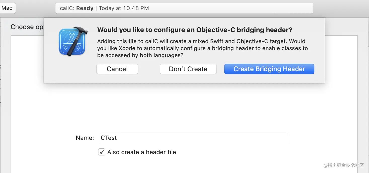 这个弹框非常重要啦,它会帮我们实现 Swift 和 C 之间的链接。