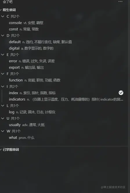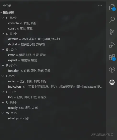 安装好插件之后会在侧边栏上多出会这样一个icon,我们点击进去就可以对当前项目中出现的单词进行分析啦